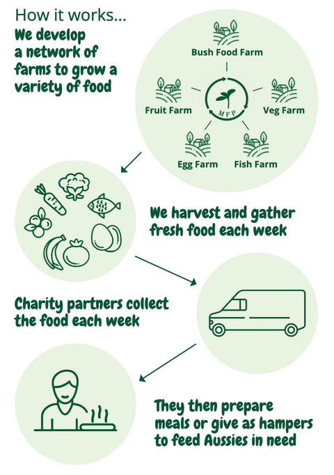 We are working to build a network of charity farms to grow fresh produce, fish, eggs, meat, and bush foods. These farms will supply our charity partners with ingredients for meals and hampers, feeding Australians in need for free each week.
